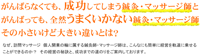 まだ、一般の国民の方にとってはその認知度は低いですが、日本でも高齢者社会に伴って着実に広がっているものです。 私は、この訪問マッサージこそ、鍼灸師・マッサージ師が自分らしく生きるための収入と余裕をもたらしてくれるものだと考えています。